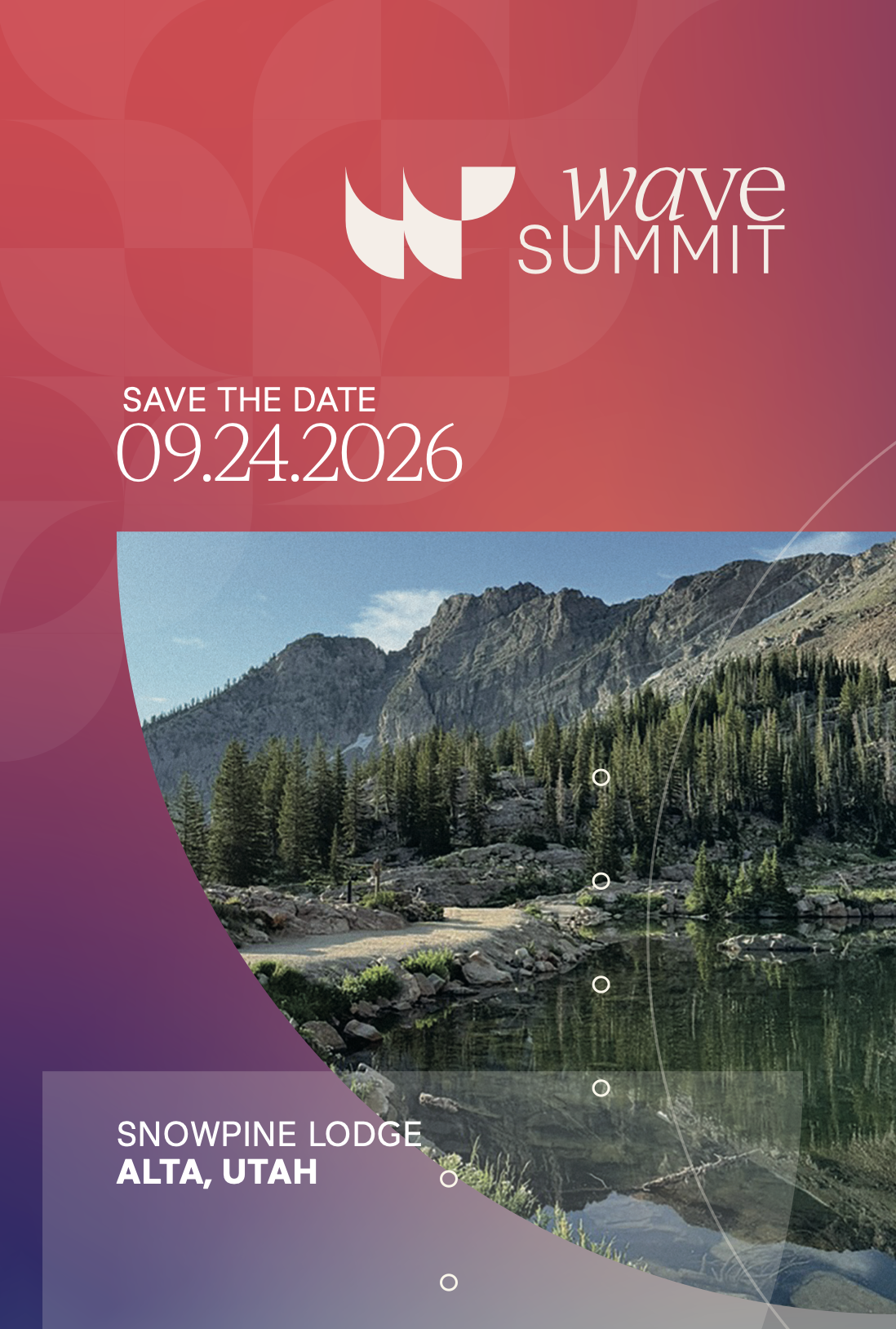 Wave Summit 2026 will take place on September 24 at Snowpine Lodge in Alta, Utah. This invite-only event convenes leaders for a focused day of candid conversation, outdoor connection, and exposure to what is next.